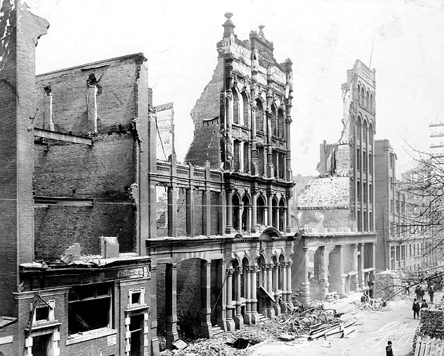 Burned out brick buildings.  All that remains is part of the front facade of these two to six storey buildings.