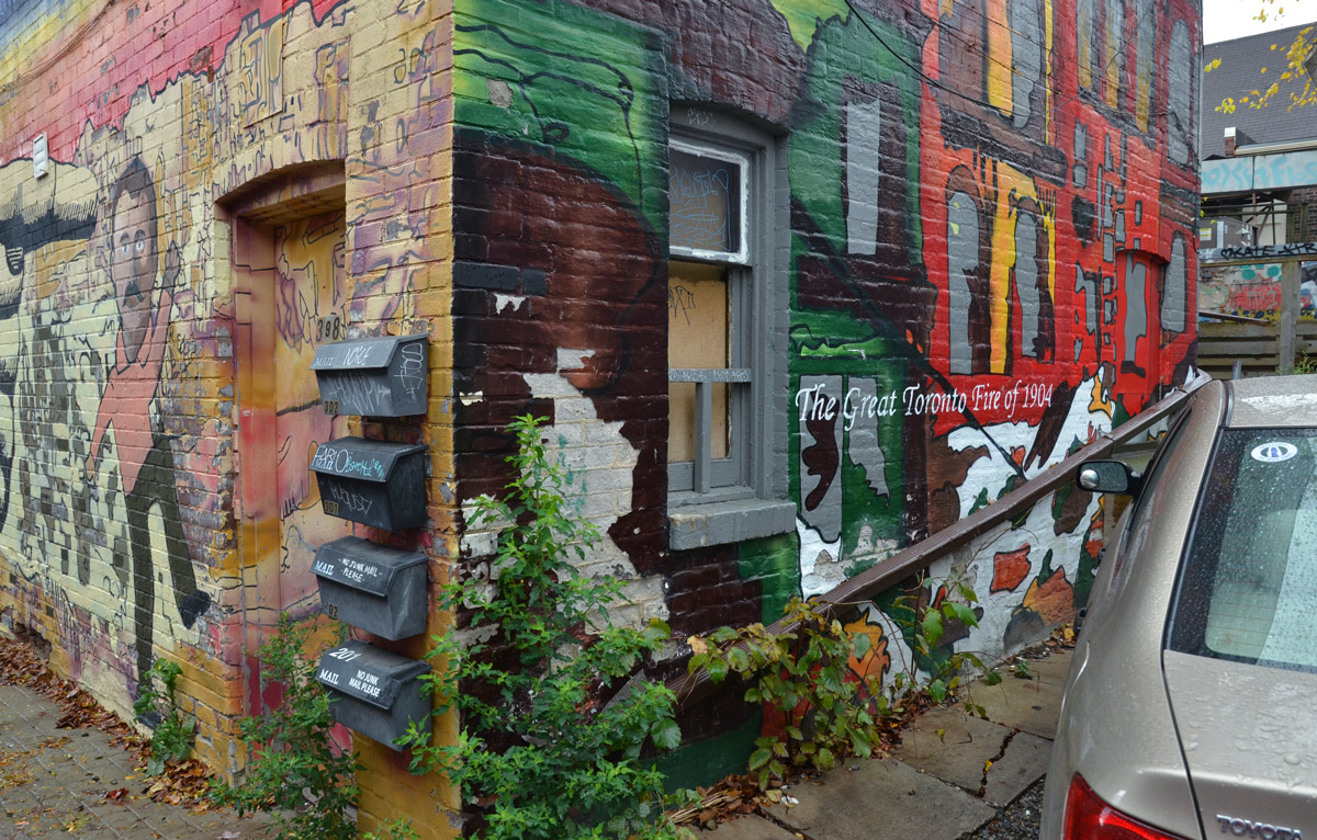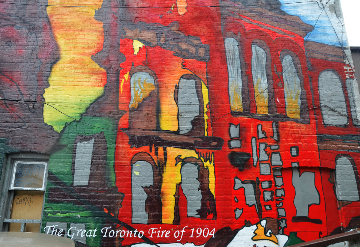 Mural painted on the back of the building on the northwest corner of College St. and Croft St.  (398 College St.), commemorating the fire of 1904.