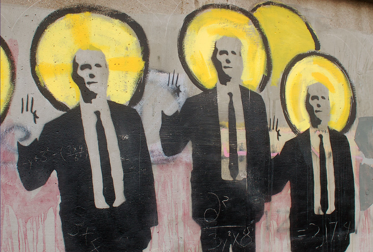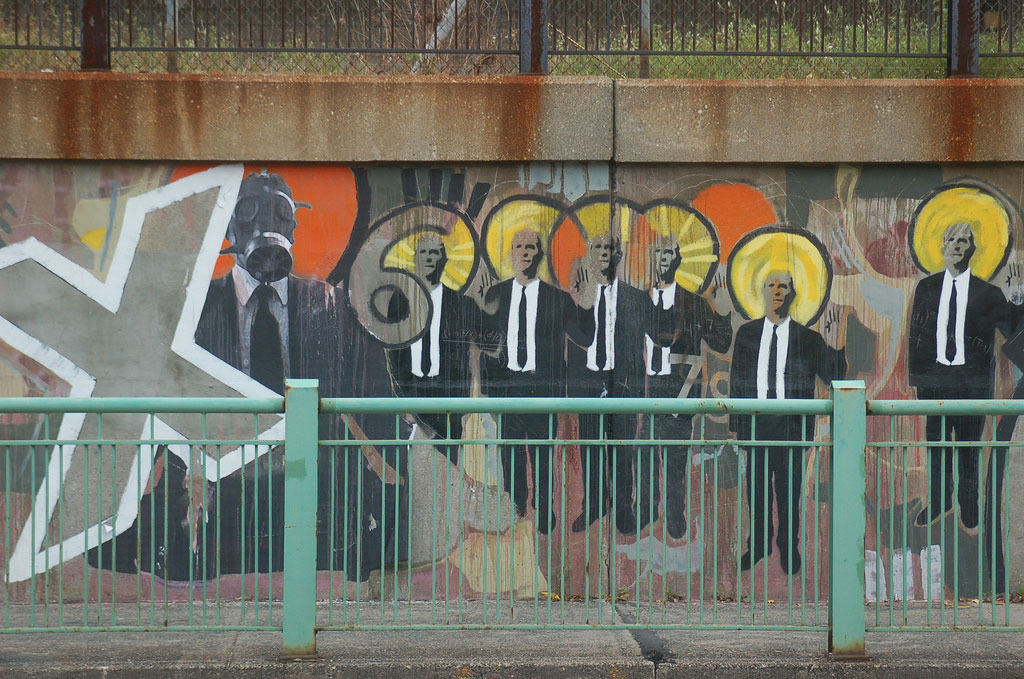 part of the suitman mural taken a couple of years ago. The letter X, the number 6, a man wearing a gas masks plus 6 men wearing black suits and ties. They have yellow halos around their heads.