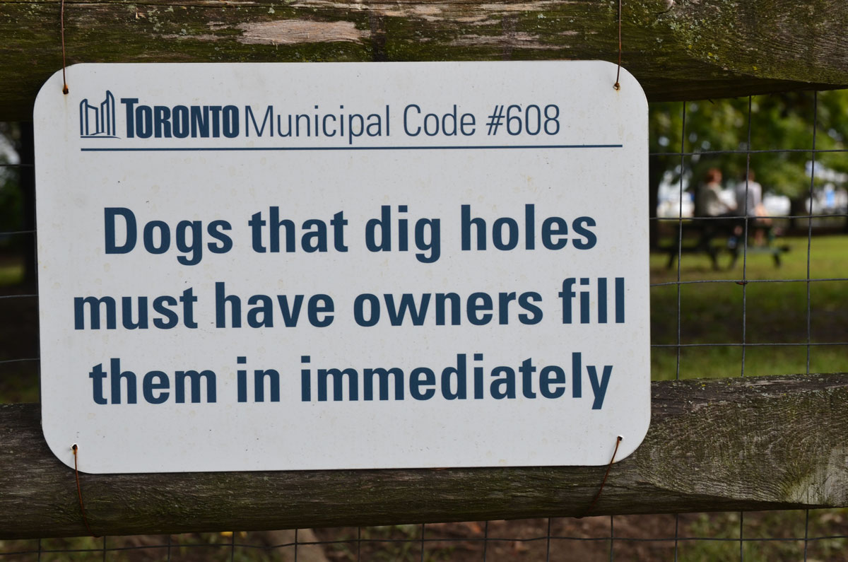 Sign on a wood fence by a park that says, Dogs that dig holes must have owners fill them in immediately.