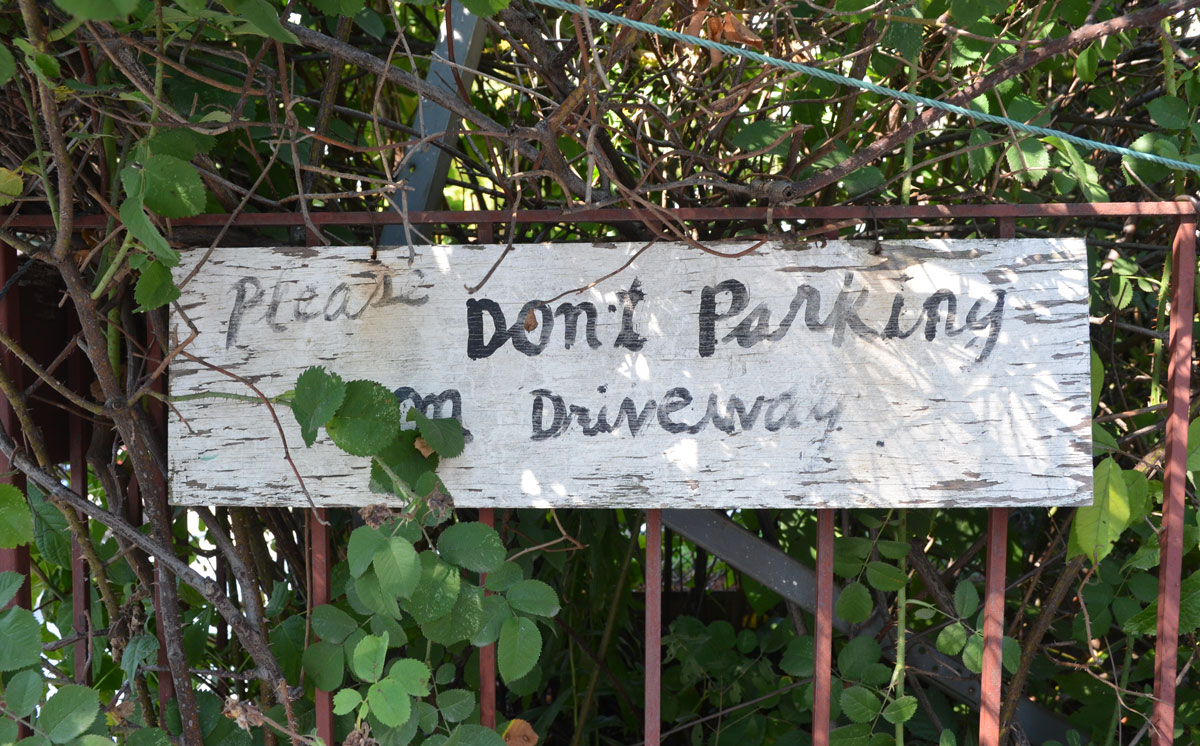 A sign on a fence beside a driveway that says Please don't parking on driveway.