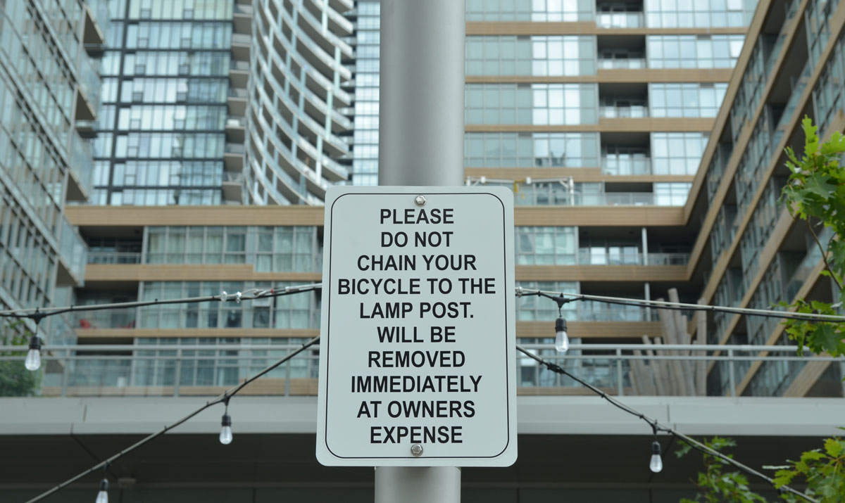Sign by a sidewalk that says Please do not chain your bicycle to the lamp post.  Will be removed immediately at owner's expense.  Large condo towers are behind the sign.