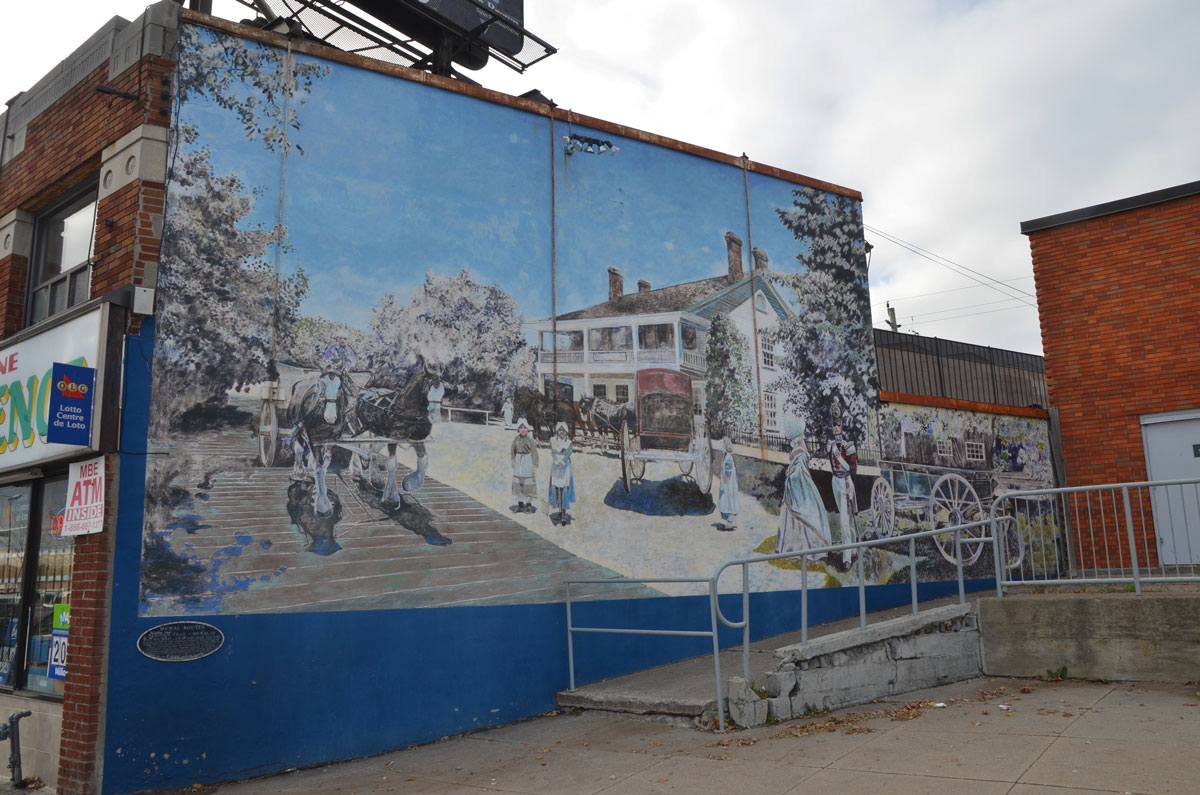 Half Way House painted in 1990 by John Hood at 2052 Kingston Road, the NW corner of Midland & Kingston Rd. It is a picture of the Half Way House inn (and stage coach stop) that stood at this corner. It’s name comes from the fact that it was halfway between the village of Dunbarton (now a part of Pickering) and the St. Lawrence Market in Toronto. In 1965 the building was moved to Black Creek Pioneer village.