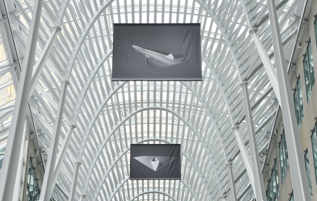 A picture taken inside the Allan Lambert Gallery at Brookfield Place, photos by Sjoerd Knibbeler, a series called Current Study large pictures standing in the middle of the gallery, as well as series called "Paper Planes" which are hung from the ceiling