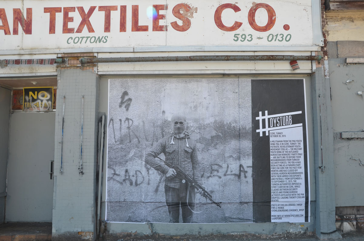 Spread around Kensington and Chinatown are 20 large black and white photos taken by a number of freelance photojournalists who are part of a group called #Dysturb. One of their goals is to present photojournalism in new ways, including as street art, with the aim of engaging people and encouraging discussion of global issues. The images are part of an exhibit for the Scotiabank CONTACT Photography Festival.