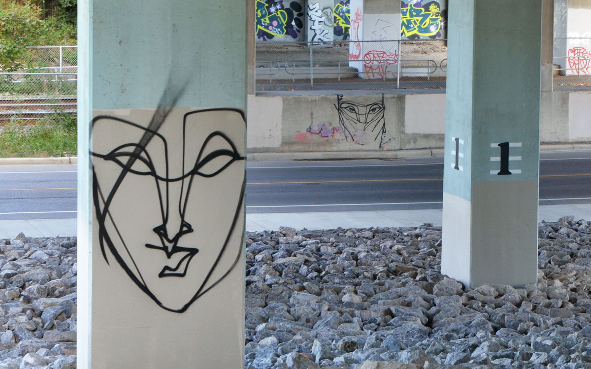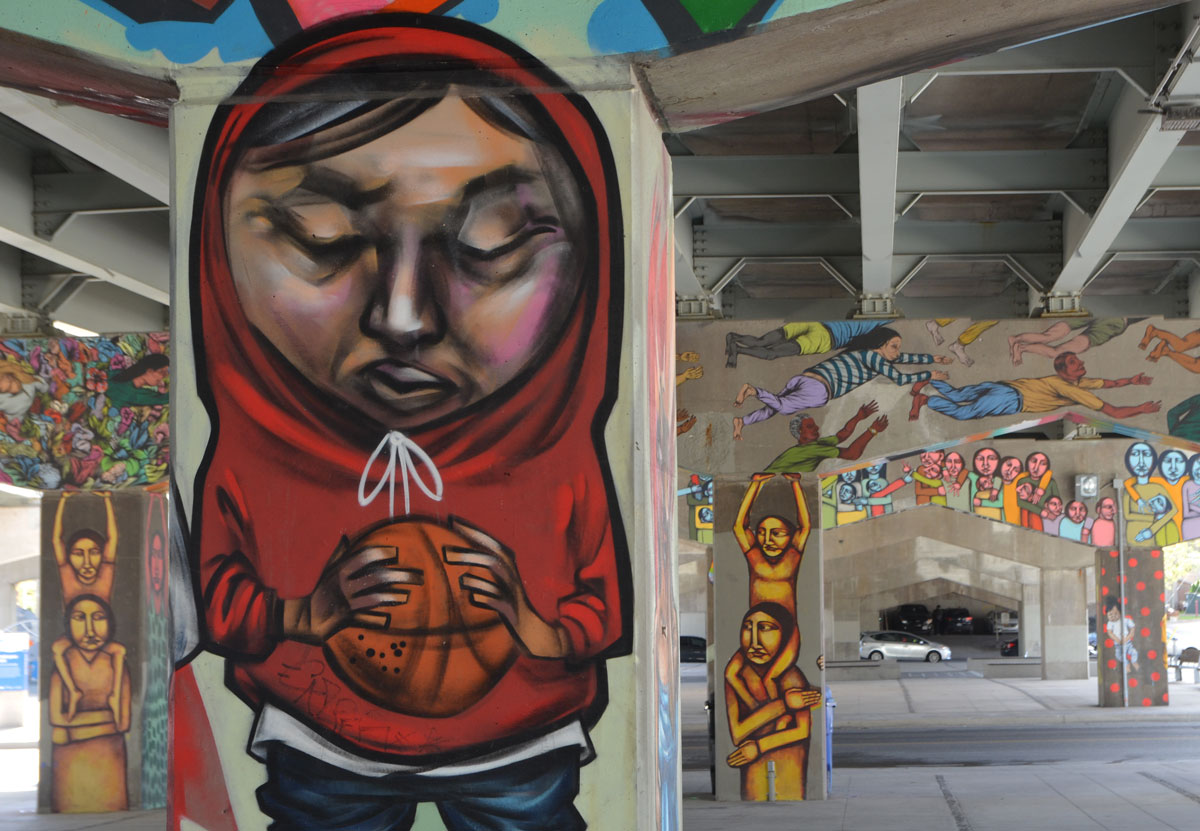 I first blogged about the murals and street art in Underpass Park last summer after the pillars and bents on the east side of Lower River Street (at the skate park) were painted. The newest paintings are on the west side of the street.
