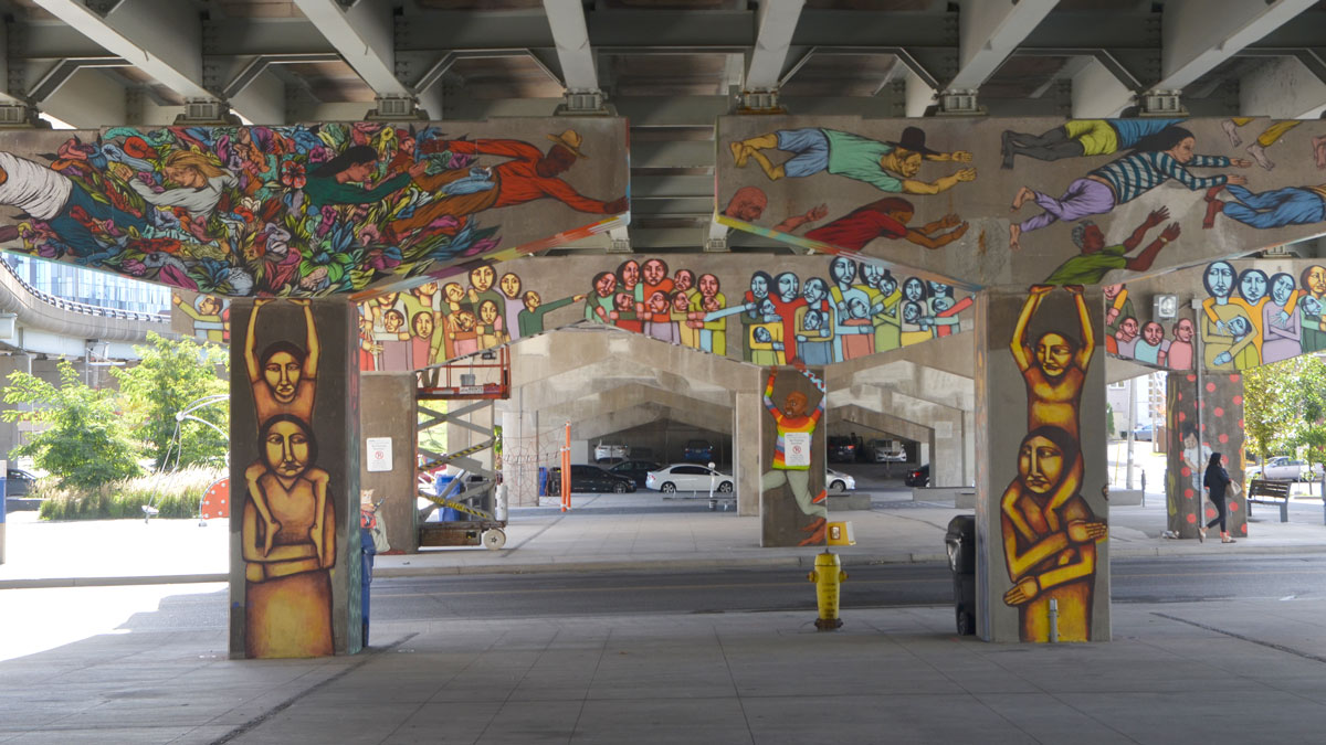 The murals on the pillars in the park are part of the StreetARToronto initiative.