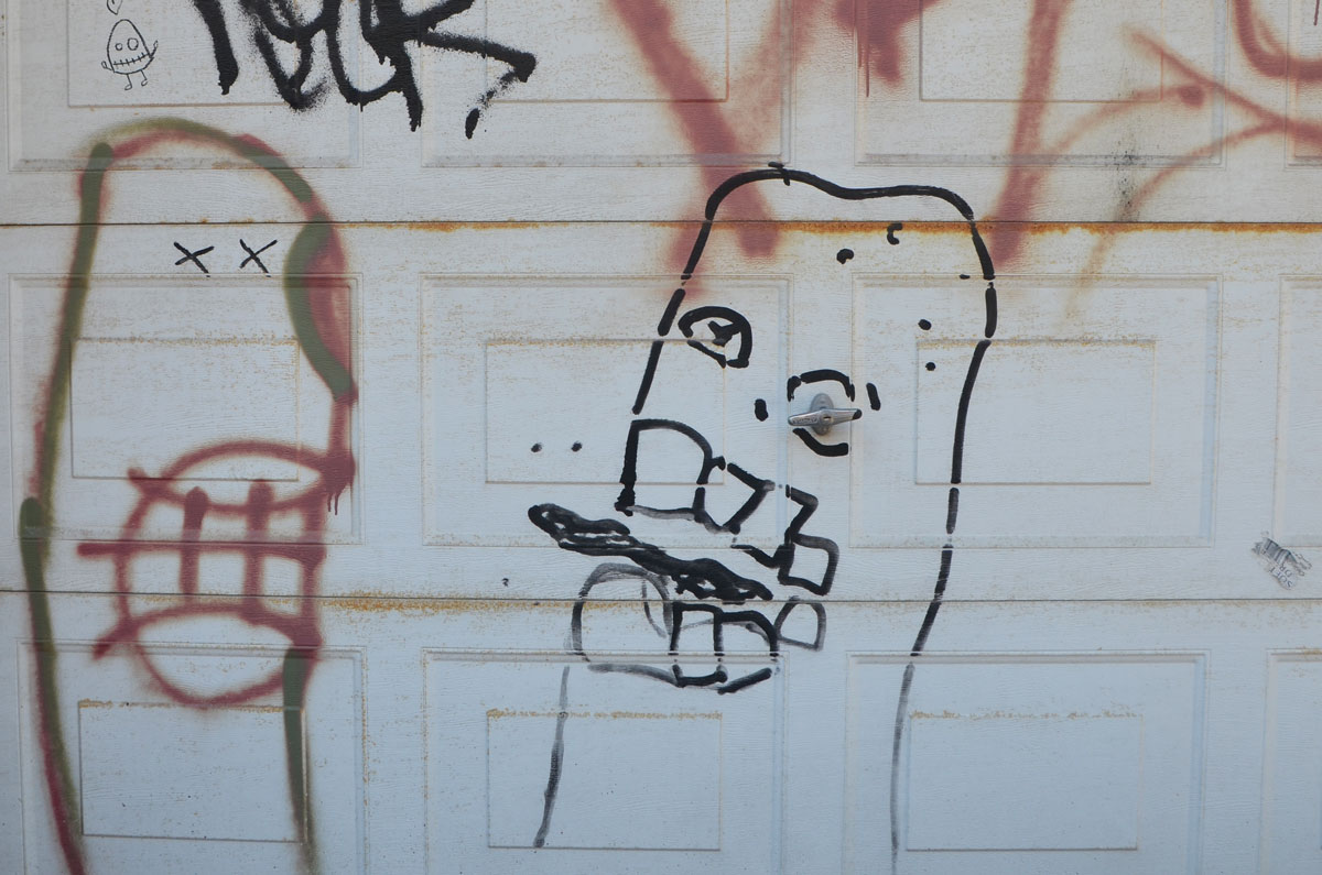 below: There really isn’t much to this graffiti but at least there’s a creative (albeit gruesome) use of the garage door knob. The poor guy is shocked and probably in pain as he’s stabbed in the eye. I’m not sure if the other fellow is screaming or laughing loudly.