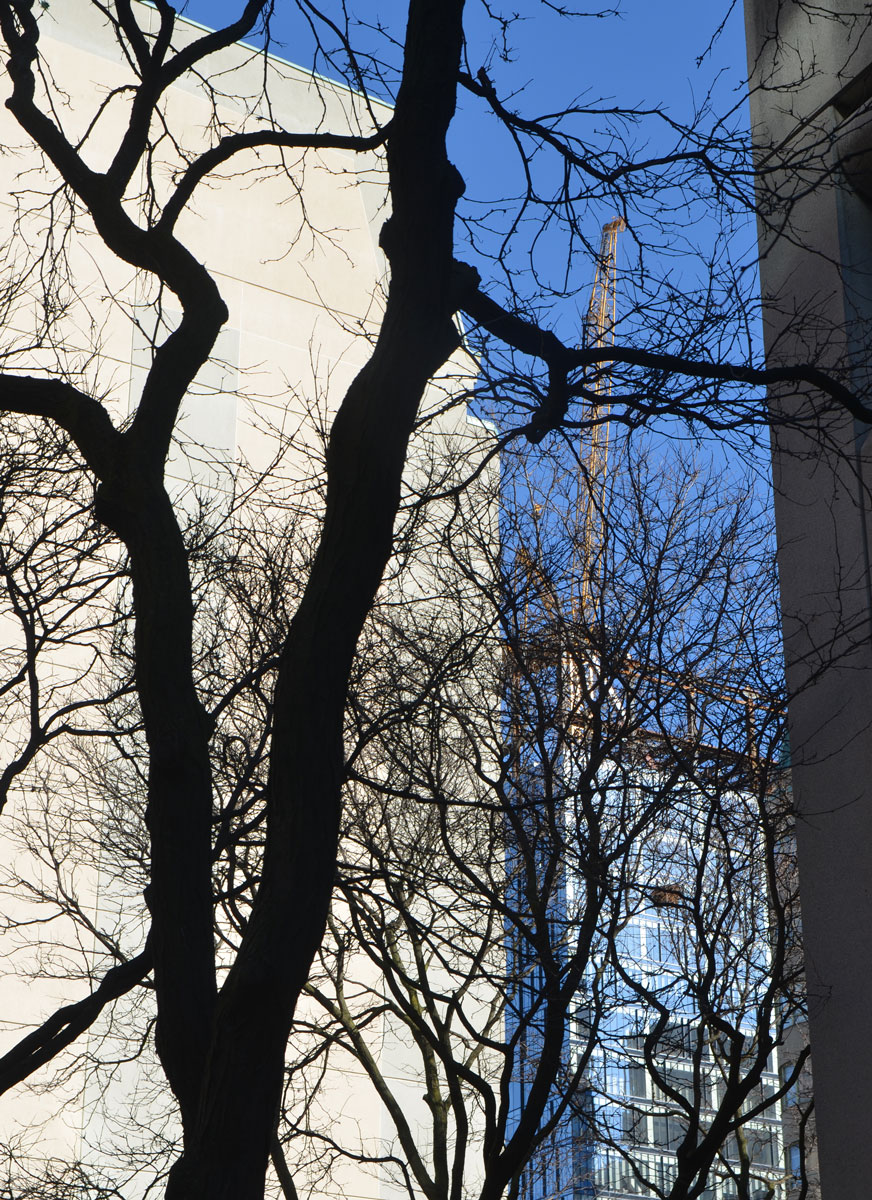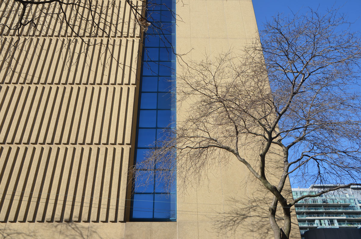 below: This is the Bell building from the Simcoe Street side. The blue glass, vertical lines in the concrete, blue sky and strong tree shapes made for an interesting few minutes while I experimented with different angles and views.