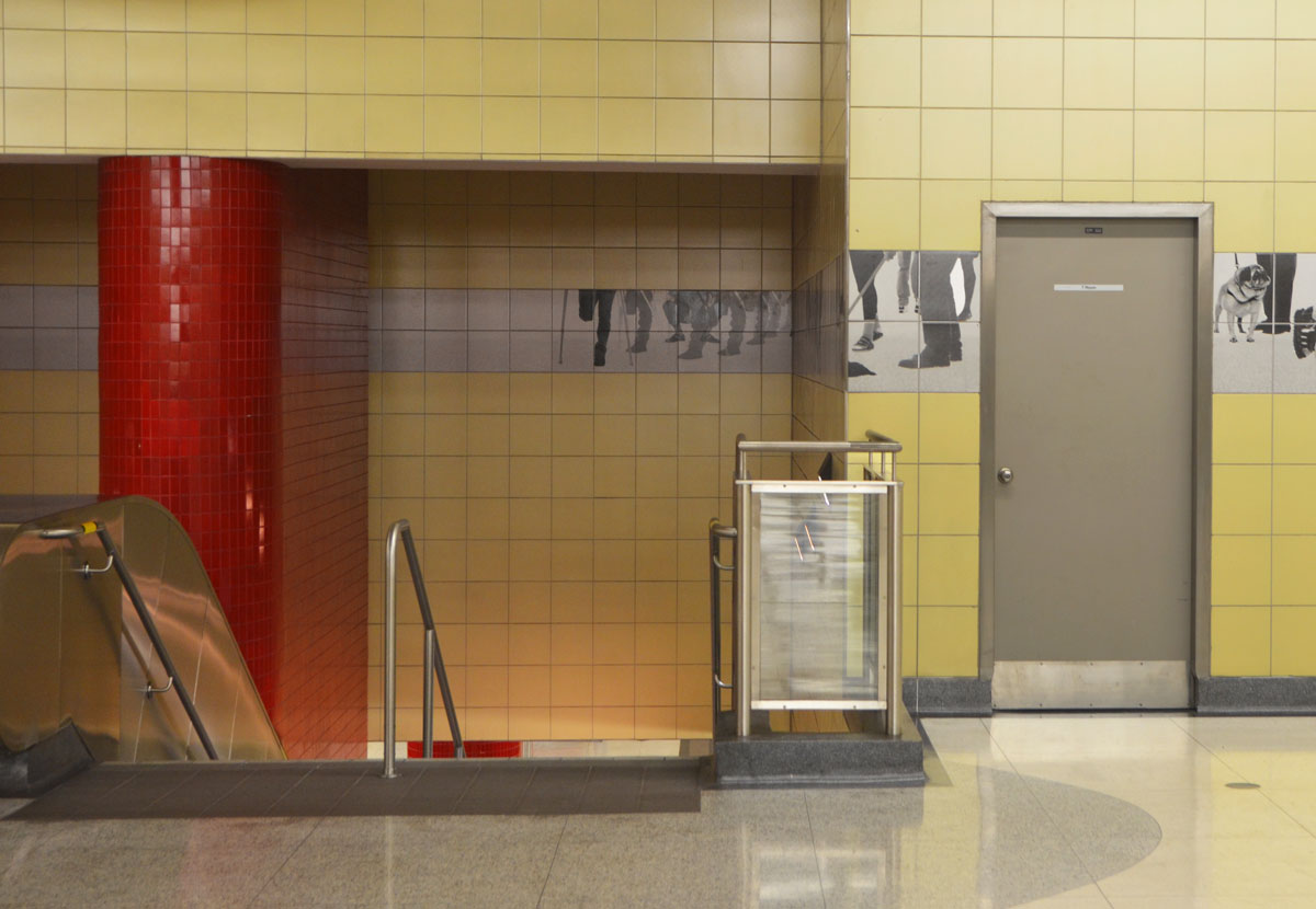 below: The artwork at track level is a continuation of the photographs by Sylvie Belanger. This time the pictures are of the backs of people’s heads and they are incorporated into the red pillars.