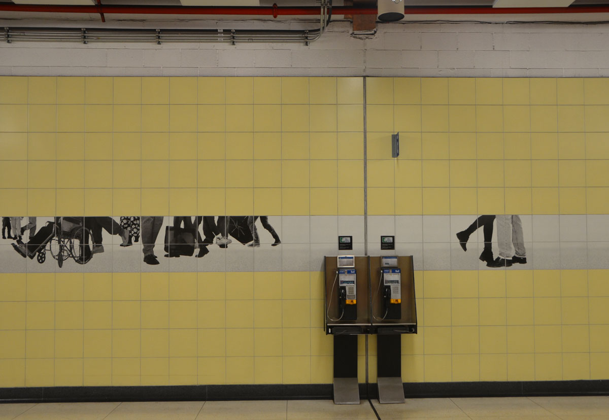 below: The pictures of legs and feet run around the whole concourse level of the station.