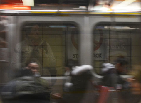 blurry person standing on the platform at Greenwood station, with reflections of people sitting on the subway