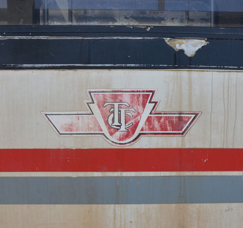 faded TTC symbol on the exterior of a rapid transit vehicle