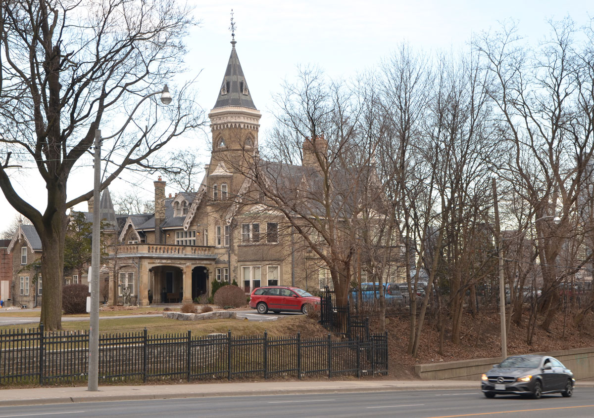 below: Looking southeast, generally towards downtown, as you come down the hill on Avenue Road.  The bright green and red on the left is the De Lasalle College playing field.
