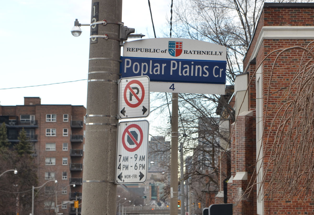 Toronto street sign that says Poplar Plains Cr and also says Republic of Rathnelly