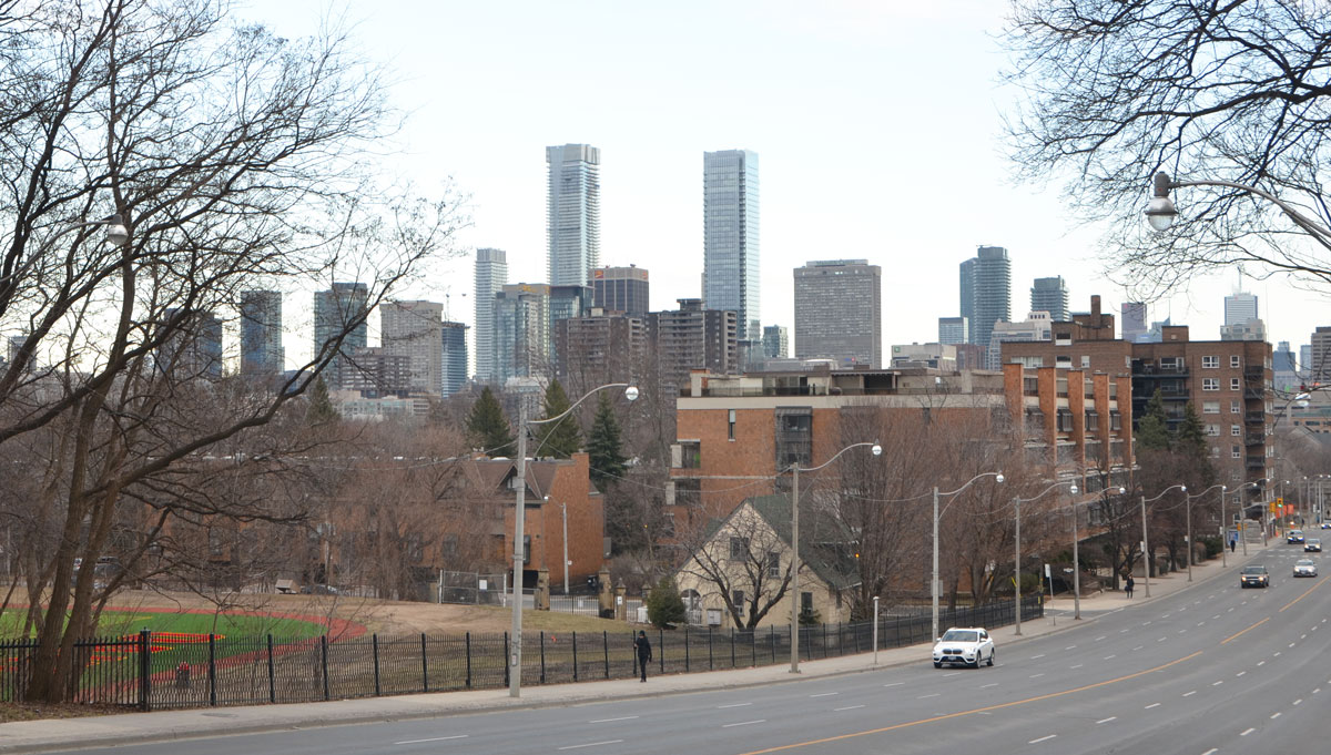 view of downtown Toronto skyline from Avenue Road, just south of St. Clair.