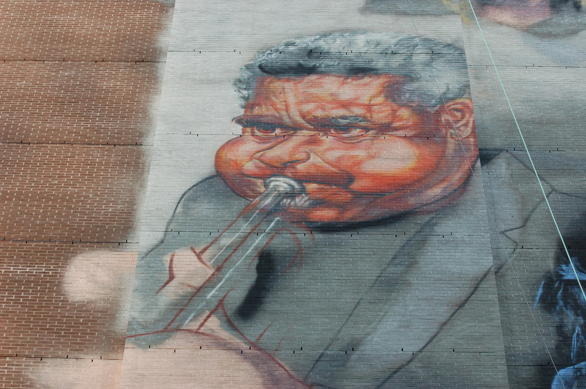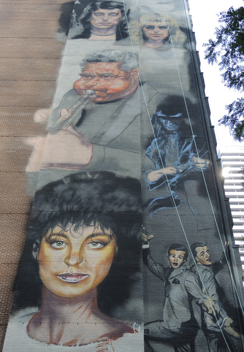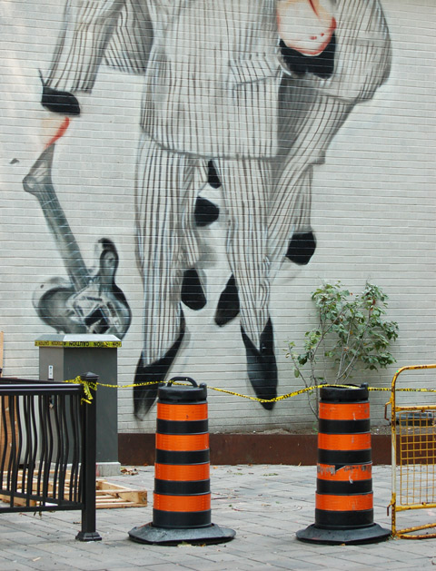 Last November I blogged about a large 22 storey mural on Yonge Street just below College (music makers on Yonge ). This mural was by Adrian Hayles and it includes many Canadian music icons. Recently, Hayles has created a matching mural of the same size on the other side (south side) of the building at 423 Yonge Street with portraits of more Canadian musicians.