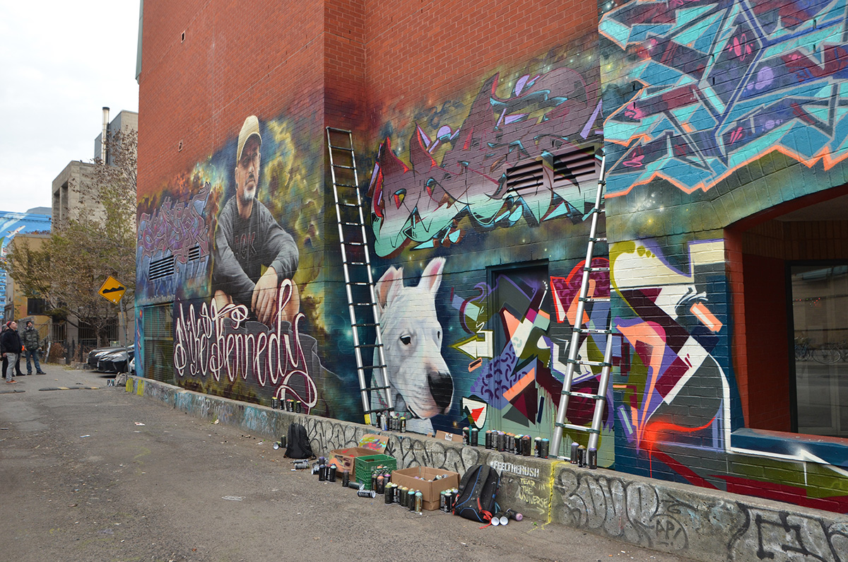 It is a memorial (and tribute) to Mike “Wunder” Kennedy who was active in Toronto’s street art community. He was the one who coordinated the painting of the large murals around Broadview and Gerrard that featured the seven new wonders of the world. You can find pictures of these murals in a blog post from September 2016 .