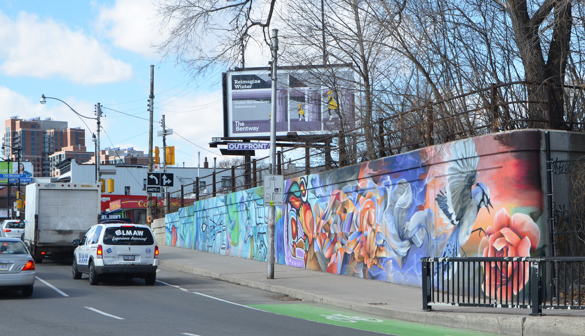 below: The most westerly part of the mural is on the north side of Dundas West where Old Weston Road and Annette Street meet.