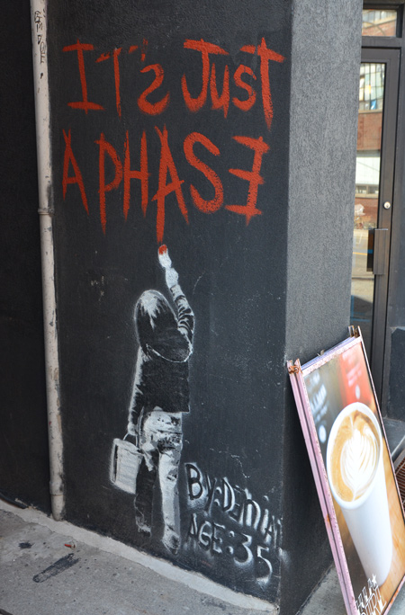 street art of a young person writing on the wall with red letters that say it's just a phase