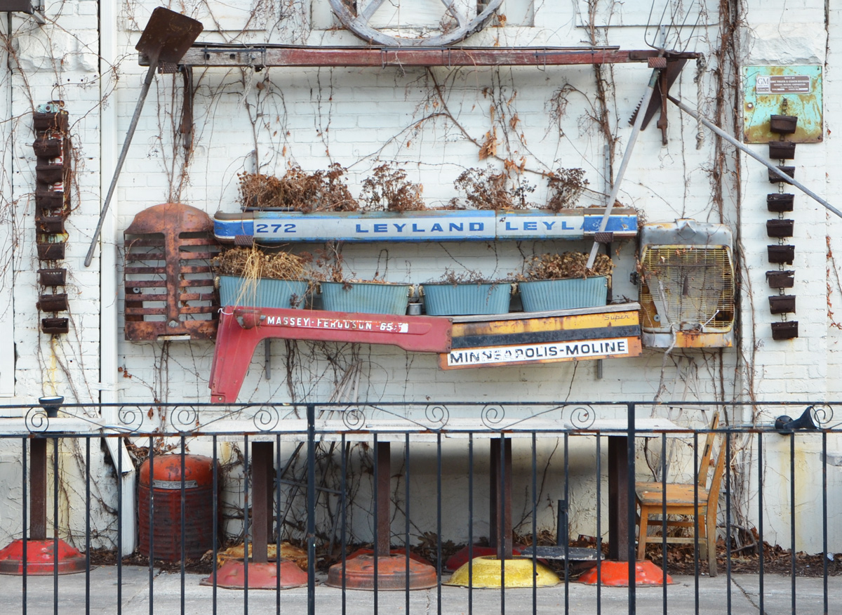 below: Reduce, reuse, recycle – here the R used is reuse.   Truck and tractor parts and other bits and pieces craftily arranged and put to use on the outside of the Farmhouse Tavern.  It should look better in a couple of months!