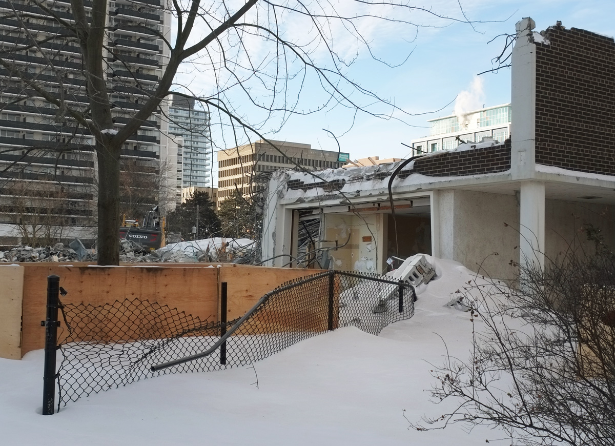 I didn’t think about it too much until I heard that it was going to be demolished – or was it going to be saved? Maybe I should take some photos of it as apparently it has some architectural value, an early 1960’s Modernist building. Then, back in November, a construction fence appeared around the property. One of those metal wire temporary fences that you see all over the city. So much for saving the building.