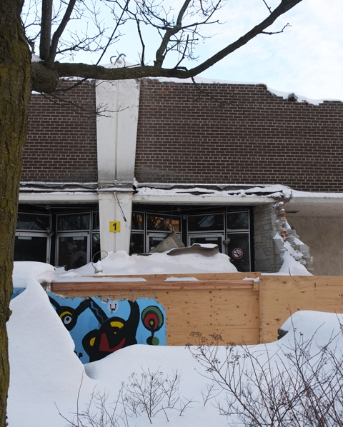 old front entrance of Davisville public school, lots of snow, broken walls as it is in the proces sof being demolished.