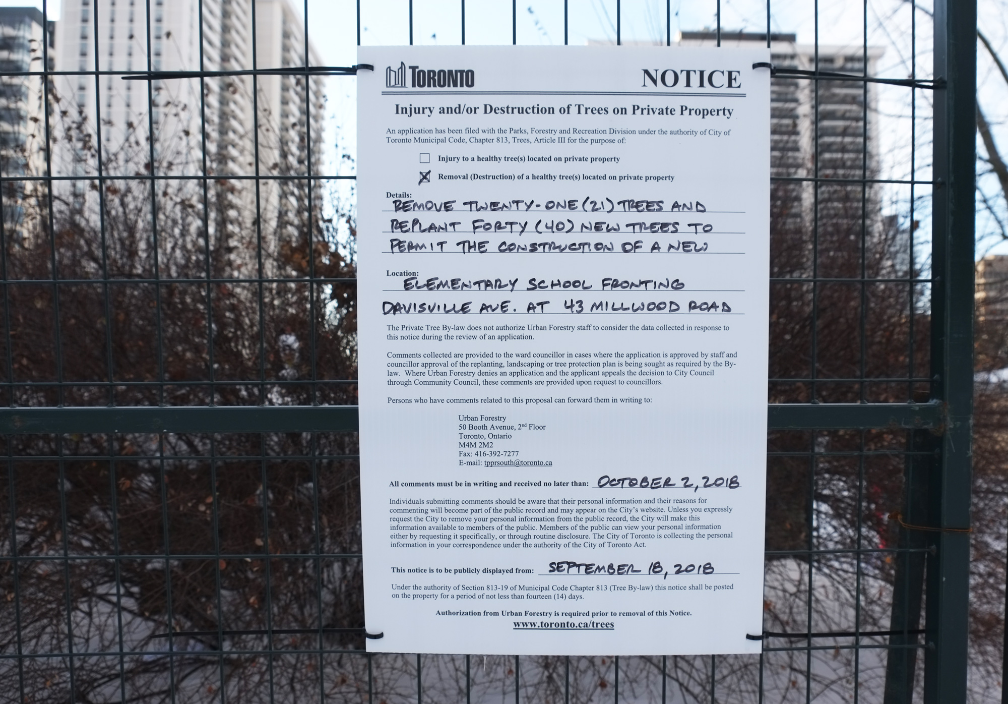 below: Notice on the fence, permit to remove 21 trees. A new elementary school is being built on the site. In the meantime (for 2 years), Davisville Junior Public is being relocated to Vaughan Road in what was previously the Vaughan Road Academy. Originally, the plan was to build the new school on the property (there was a large playground) and then tear down the old (Globe & Mail Feb 2017)