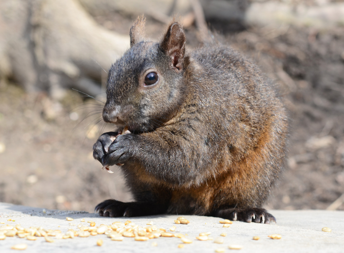 below: A squirrel enjoying the seeds that someone has left for it. w