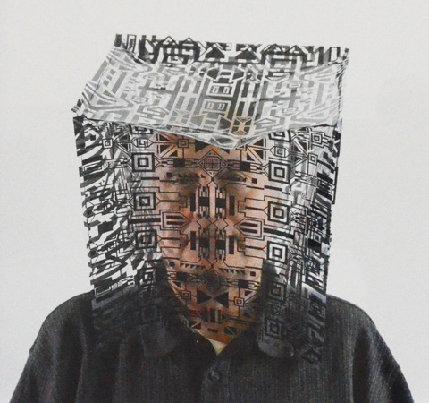 below: From the gallery website, “In a new series of ‘Fragment’ portraits, Monnet has developed individualized masks that overlay the faces of chosen subjects. Mixing facial features with geometric shapes, new identities are forged through abstraction and interference.”