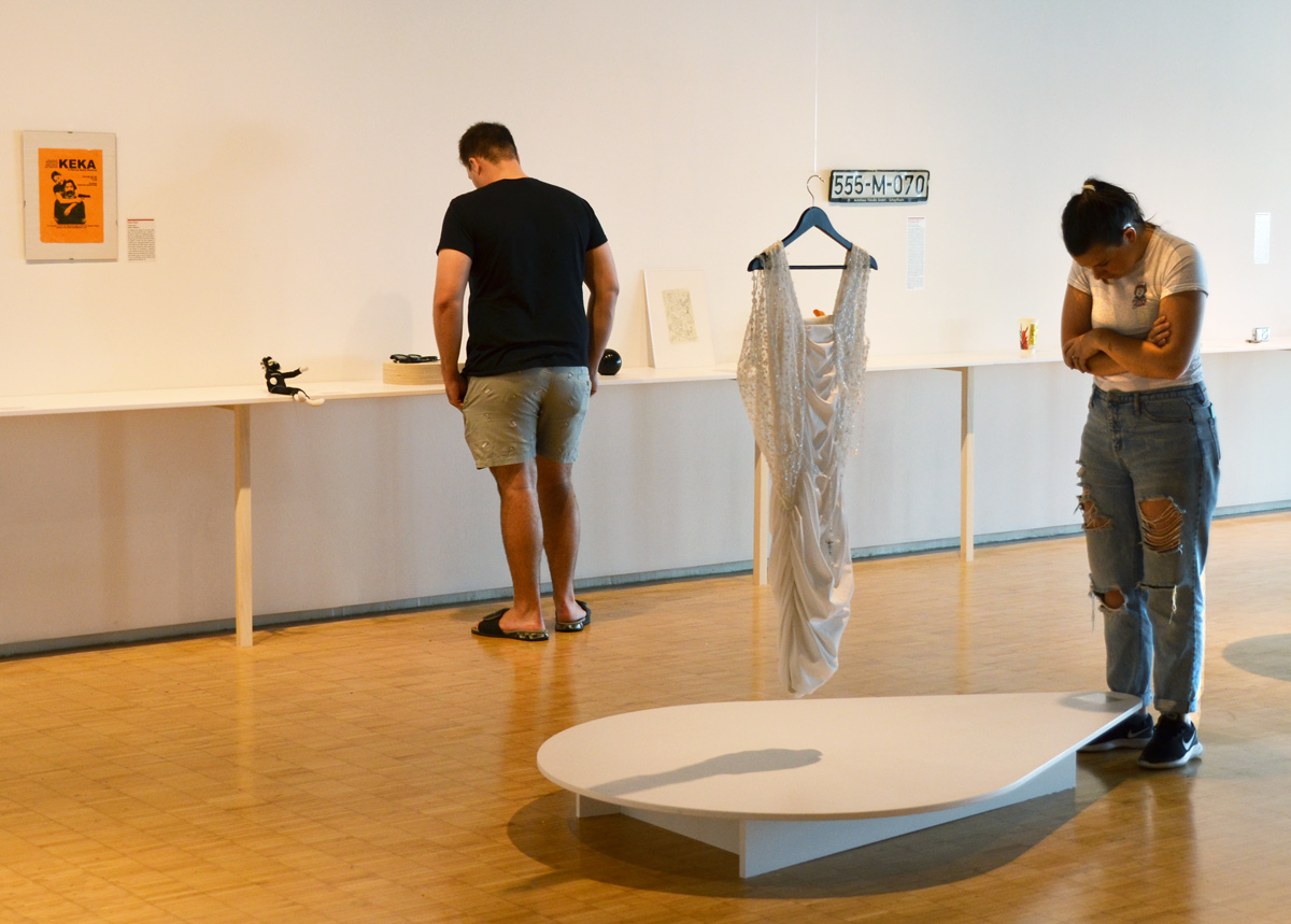 a man and a woman looking at objects and reading the stories on display at the museum of broken relationships