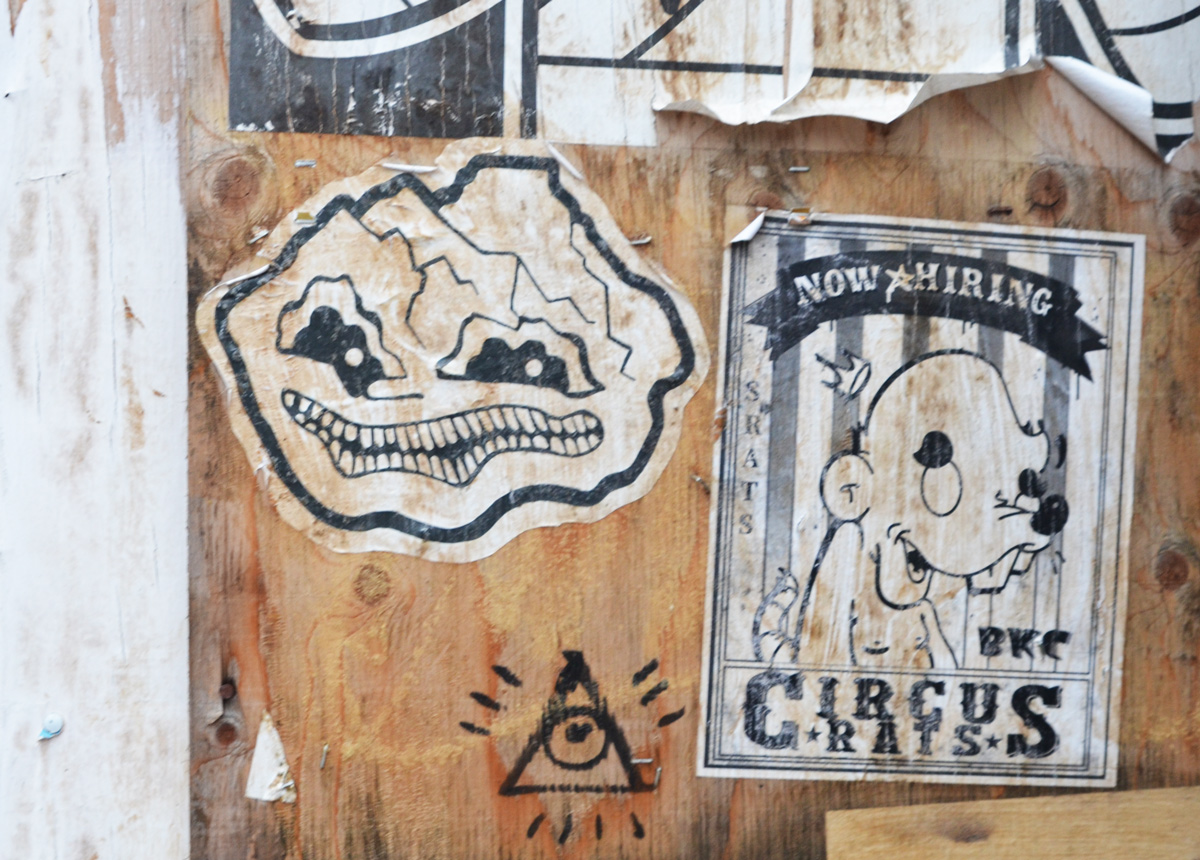 below: Looking a bit weathered on this piece of plywood is a paste up by sketchrat, (aka srats) Now Hiring Circus Rats.