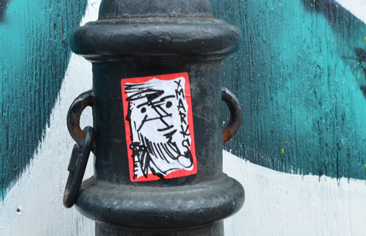 below: This old orange stikman has lost his head. In its place is a sticker for eddaviel aka Edison Montero