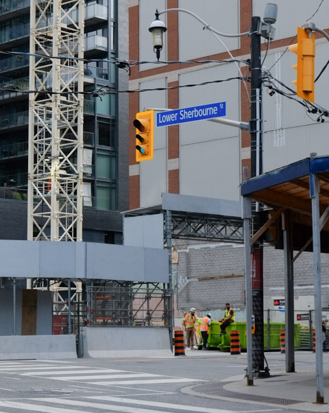 below: Looking west along Queen Street towards Yonge (behind the hoardings).