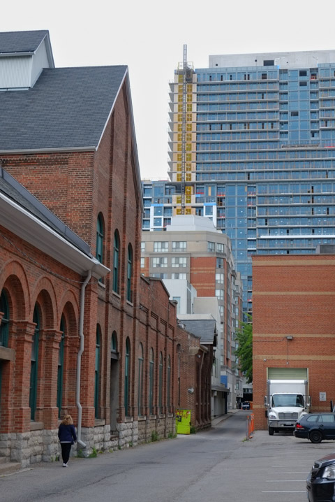 My previous post was about wandering around the Distillery District which by the way is 20 years old now. Back in 2003 it was surrounded by a part of the city that seemed to have been forgotten. In 2015 the PanAm games were held in Toronto. Athletes Village, i.e. housing for the athletes competing in the games was built new in what was now being called the West Don Lands. After the games, this housing was converted to “746 market-priced condos, 41 market-priced town homes, 250 affordable-rent apartments, 257 student dormitory units for George Brown College, office and retail units, and a YMCA recreation centre.” (Wikipedia) Development in the area continues on all sides of the Distillery.