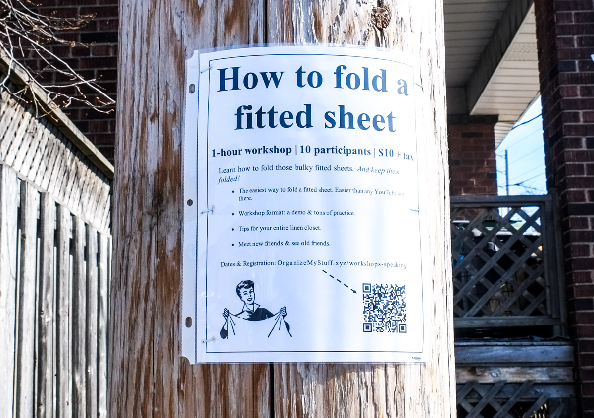 below: I saw a lot of these posters that day – How to fold a fitted sheet. Once upon a time such posters had a phone number written on little flaps that you could tear off. Now we have the dreaded QR code. Apparently there is now something called “quishing” which is QR code phishing (I am not calling this poster fake, I am just ranting about QR codes in general – like how annoying they are on menus because now everyone has to get their phones out).