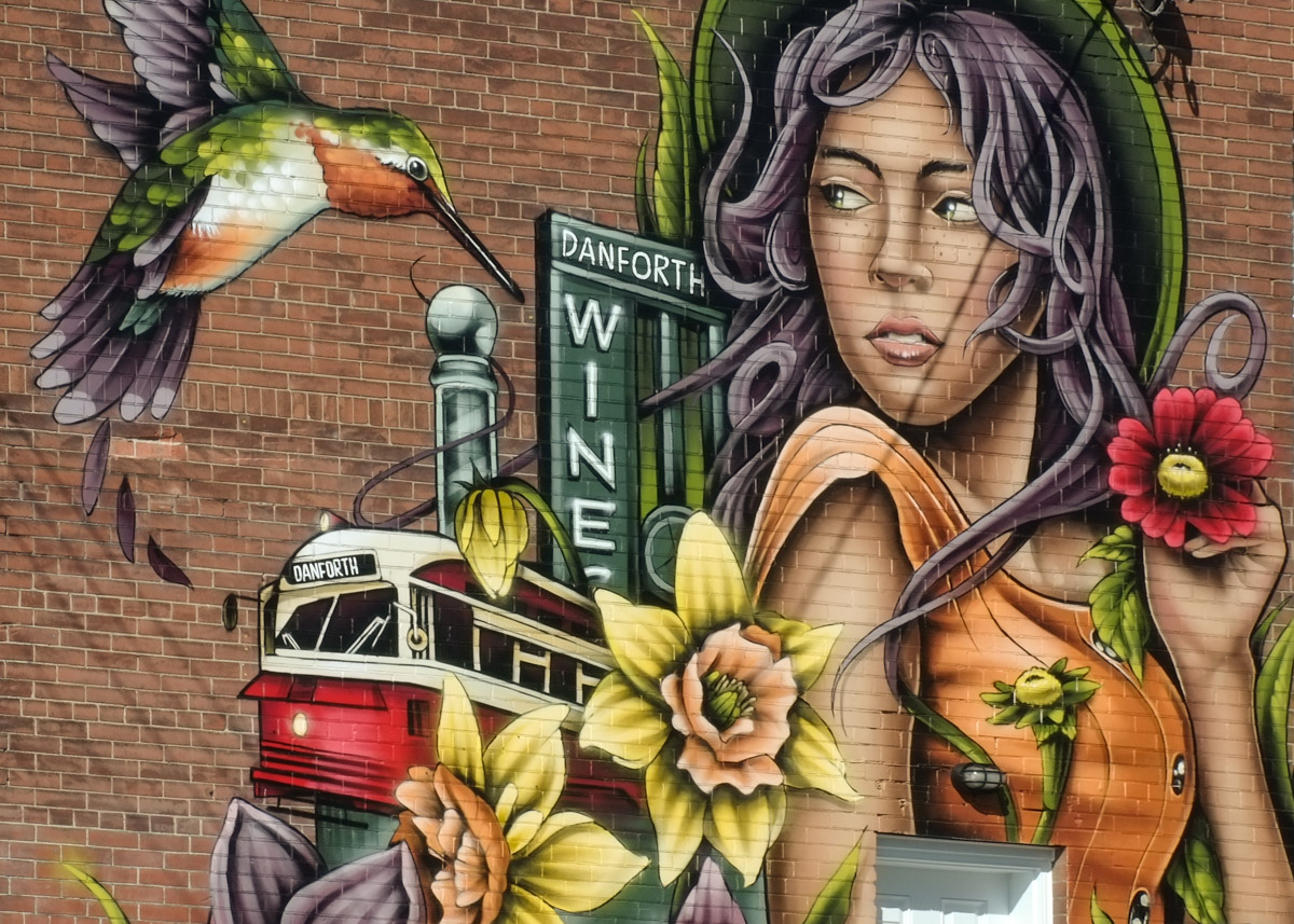 below: “Humming on Woodbine” – A hummingird and a young woman with daffodils in yellow and purple, a mural by Blazeworks at Woodbine and Danforth.
