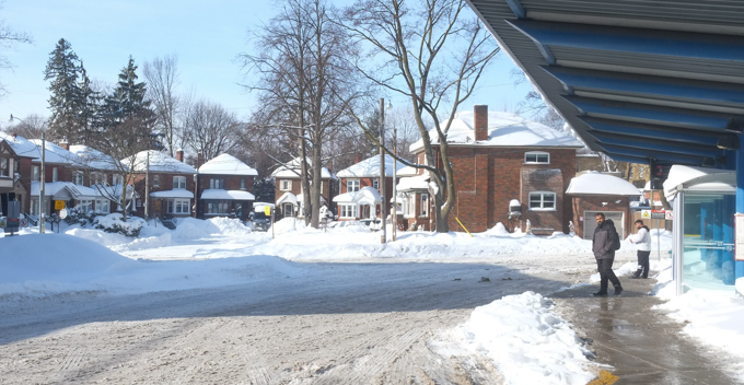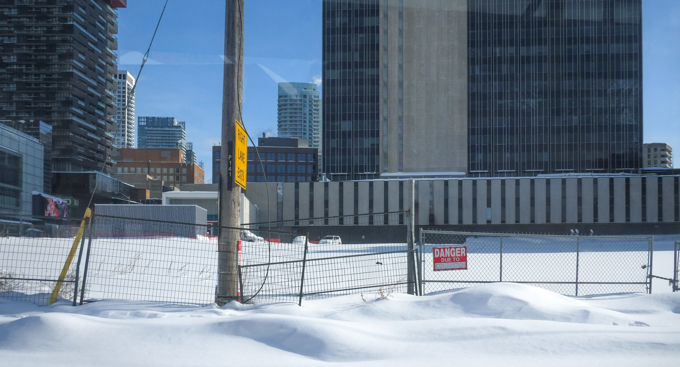 … because there is also no subway here either! This is the view northward up the Allen Road. There are not a lot of cars on the road. The center section, i.e. the train tracks, are still covered with snow.