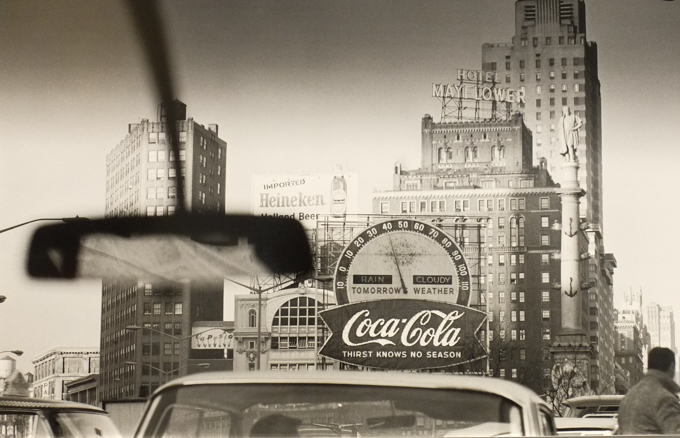 photograph taken out the front window of a car of a New York City scene with billboards and tall buildings