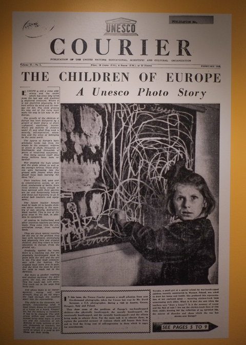 below:  Some of David Seymour’s photos ended up in the UNESCO publication “Courier”.  This is the front cover of the February 1949 edition, with the headline ‘The Children of Europe’.  The photo was taken in a Warsaw orphanage.   The printed story starts with: “Europe is a stone wilderness and the smoke which has since long lifted from the last war still discloses a shattered continent.  Where it is not shattered physically, it is hurt within its mind and its courage for life.  The child groping his way out of the ruins must make his way to life now in this Europe.”