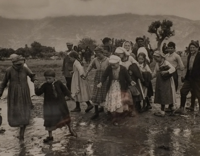 black and white photo by David Seymour, a group of children being led on a walk, crossing a river