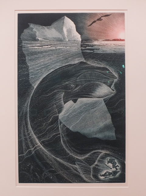 Blackwood (1941-2022) was born and raised in Newfoundland.  This retrospective exhibit features more than eighty of his prints and drawings.  Most of the prints are etchings.  In a couple of cases, a series of prints shows the development of a finished piece.  The images are very much Newfoundland and Labrador with sailing ships and large icebergs playing a big role.  There are lots of people in boats!