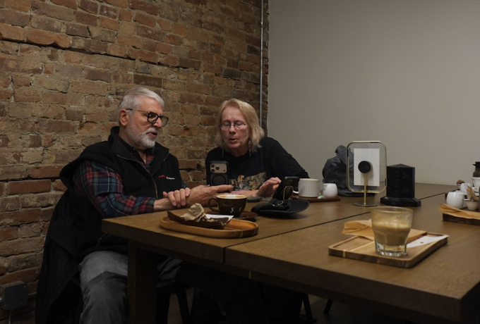three people sitting around a small table in a coffee shop, on their phones
