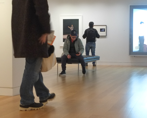 man on phone, sitting on bench at art gallery of ontario, while others around him are looking at pictures on the walls