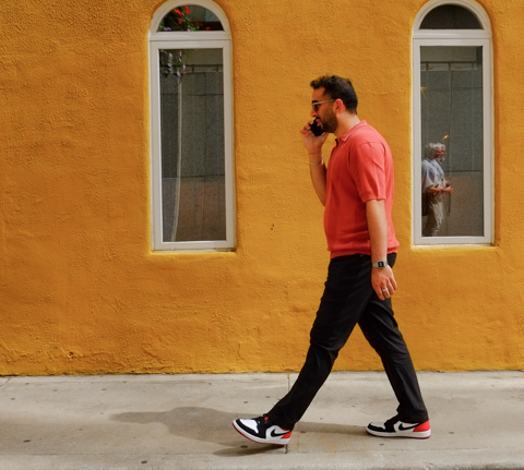 man wearing red shirt and black pants, talking on phone, walking past a very orange building with two tall vertical windows