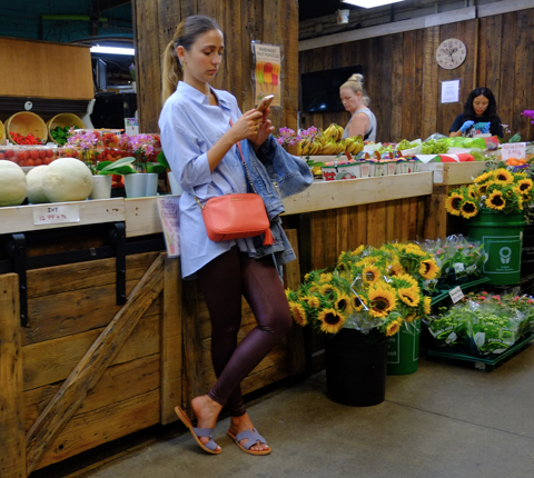 woman on phone, standing, leaning against display of fruits and vegetables for sale, St. Lawrence market, big bucket full of sunflowers by her feet
