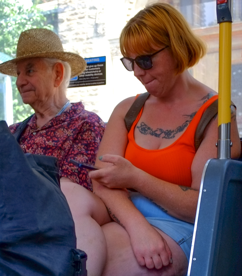 men riding on TTC bus, on phones