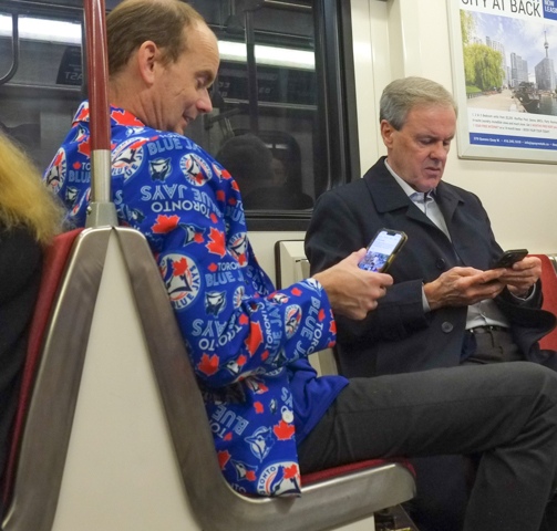 man wearing blue jays, baseball team, theme jacket, while looking at his phone, sitting in TTC subway car