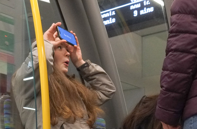 teenage girls playing games with phone on the streetcar