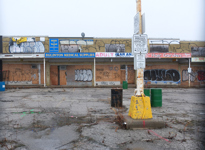 Redevelopment in Toronto is slow. This plaza (strip mall) at Kennedy and Eglinton was already boarded up in 2021. It looks a little scruffier and a little rougher now but otherwise, not much has changed in five years.
